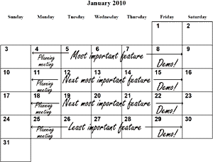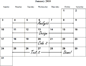 在传统的项目流程中,我们一个接一个地安排团队的活动(activity),从项目启动直至结束:先做分析,然后做设计,接着再编码、测试,诸如此类。我们制定这样一个时间排期,目标是在项目结束时所有工作都已完成。排期临近结束时,我们向客户展示新的软件,希望客户喜欢。